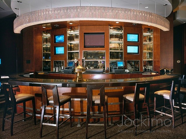 Jockimo provided over 80 Antique Tarnished Mirrors on this redesigned portion of the casino. All glass is 1/4" tempered and was supplied cut to size per our customers request. The mirrors are used in the bar on the Casino High Limits Floor - the mirrors line the back bar shelving.
