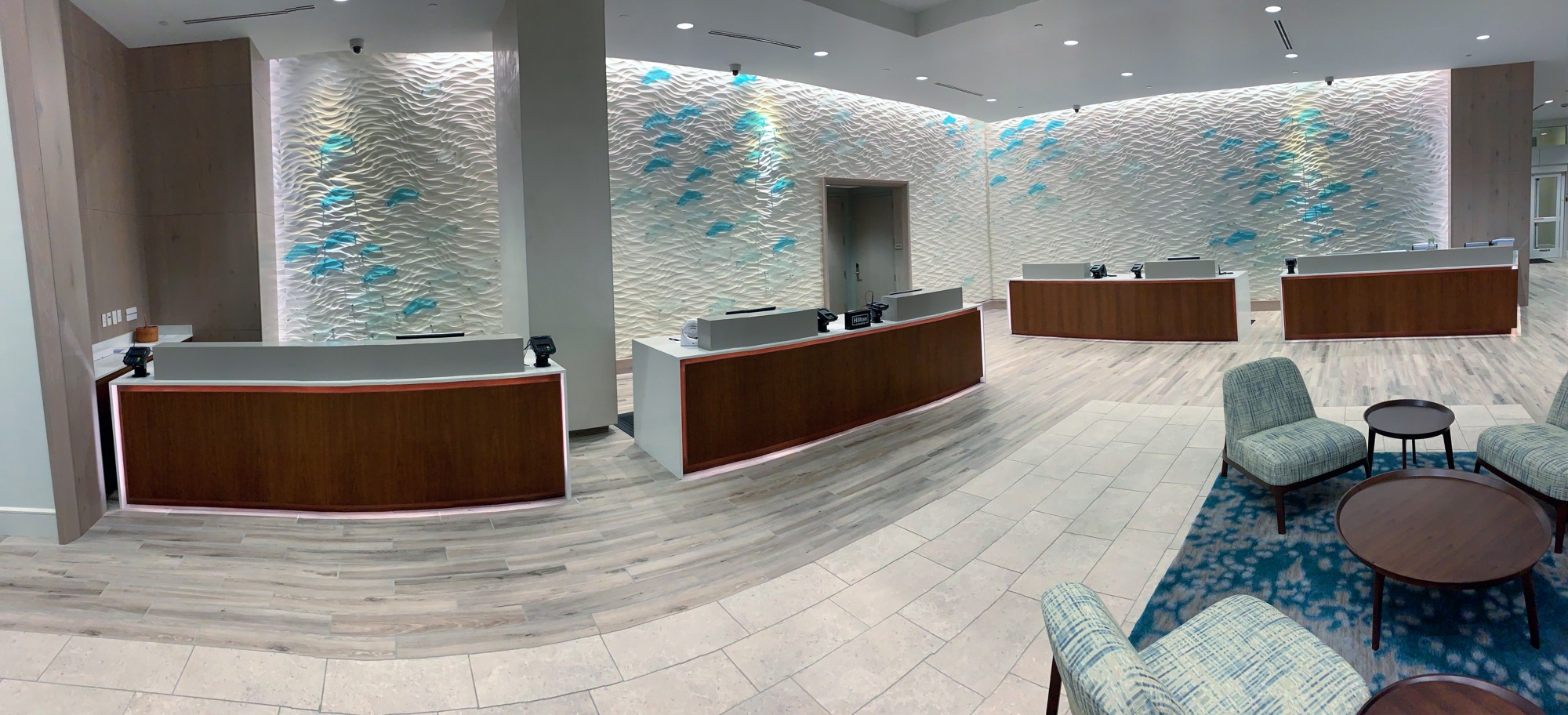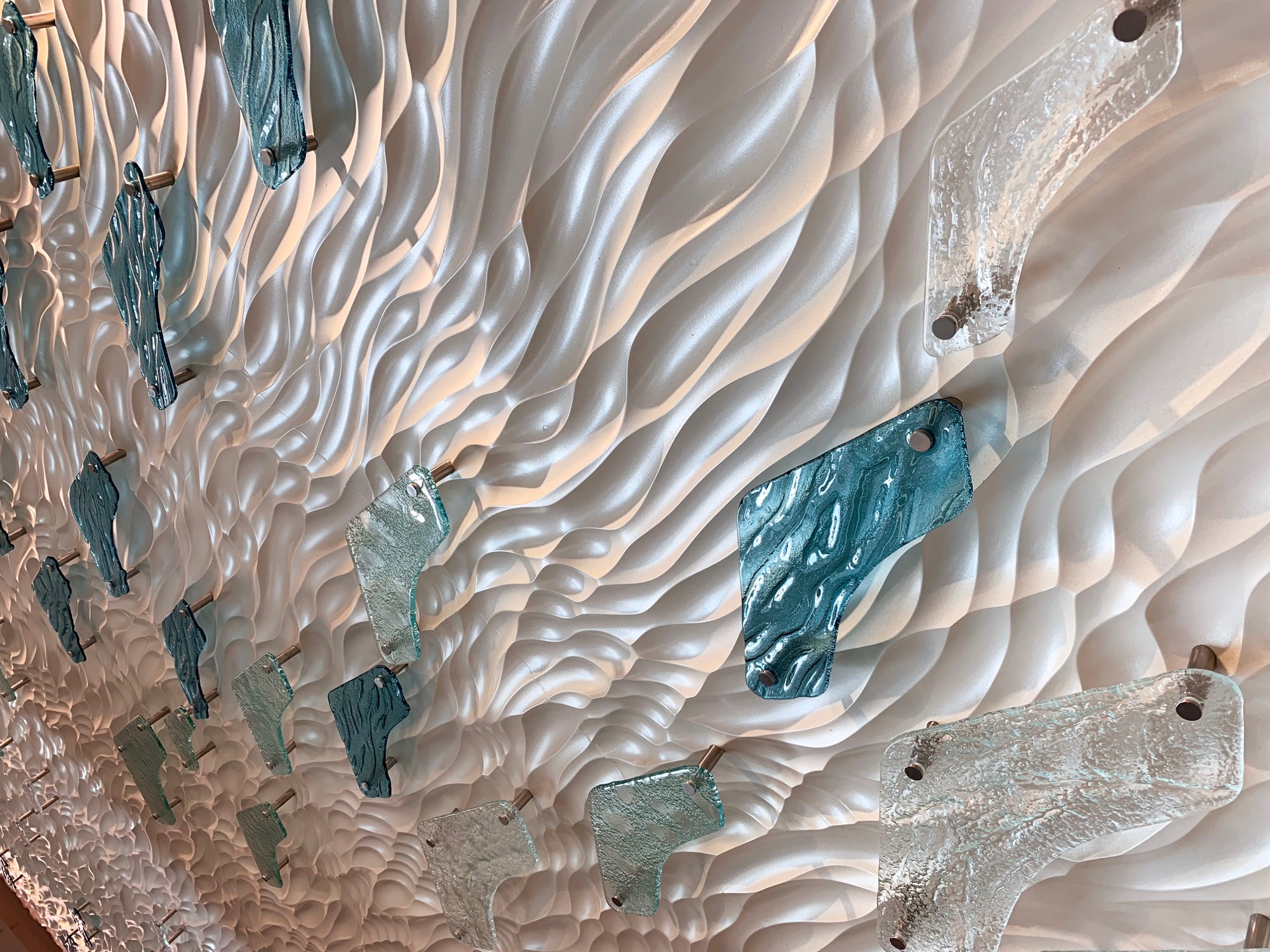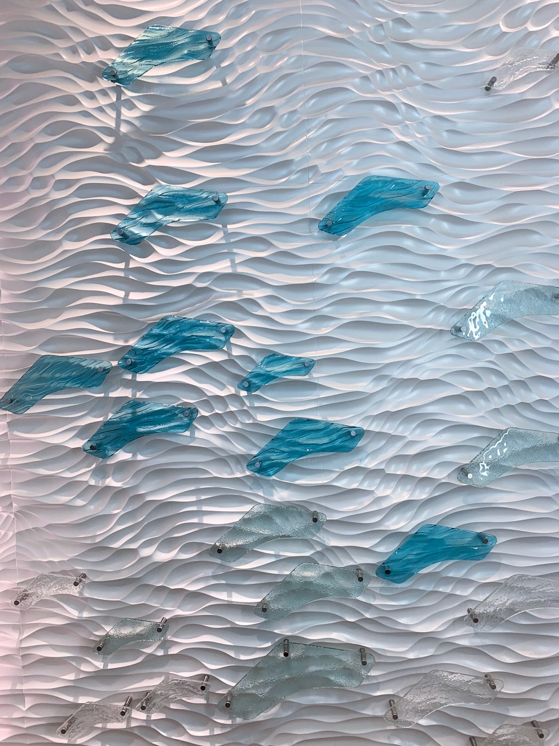 Jockimo provided the glass "fish" for the feature wall in this brand new hotel in SC. Jockimo provided the glass "fish" for the feature wall in this brand new hotel in SC. The project inclides 3 different textures, 3 different glass colors and 3 different sizes of "fish".