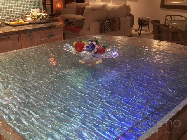 Our Cast glass Wooded texture panel sits on top of a panel of our laminated DichroGlass™. The glass is backlit to provide a one-of-a-kind glass counter top for this kitchen island. The customer wanted a blue ocean feel and we think they got exactly that.